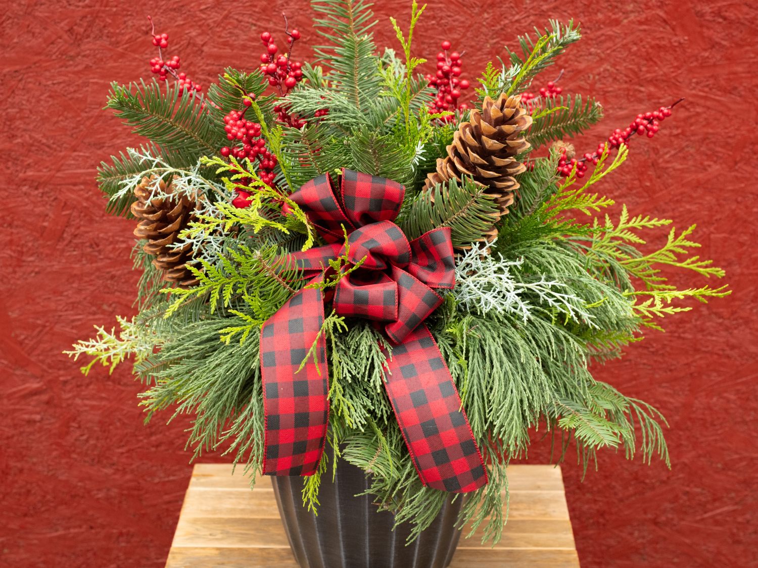 Grown locally by Bauman’s Farm & Garden. Deck the halls—and your porch—with this festive holiday porch pot.